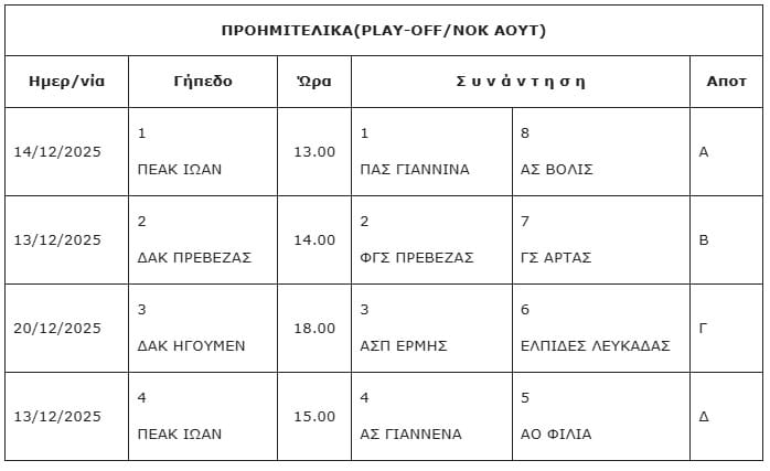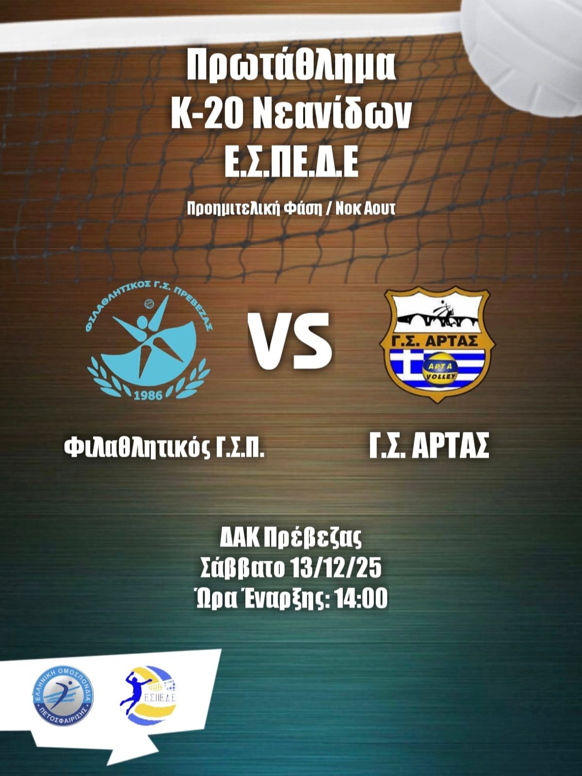 Το ΣΑΒΒΑΤΟ 13/12/205 ώρα 14:00 στο ΔΑΚ ΠΡΕΒΕΖΑΣ θα αντιμετωπίσει την ομάδα Γ Σ ΑΡΤΑΣ σε νοκ άουτ αγώνα για να γίνει το επόμενο βήμα για τη κατάκτηση του τίτλου.