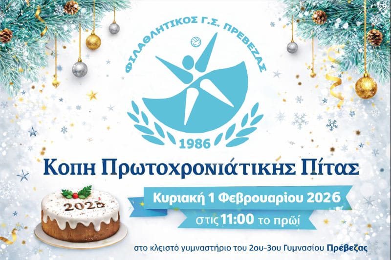Το Διοικητικό Συμβούλιο του Φιλαθλητικού Γυμναστικού Συλλόγου Πρέβεζας προσκαλεί τα μέλη, τους φίλους του συλλόγου, καθώς και τις αθλήτριες των αγωνιστικών τμημάτων και της ακαδημίας, στην καθιερωμένη κοπή της βασιλόπιτας.