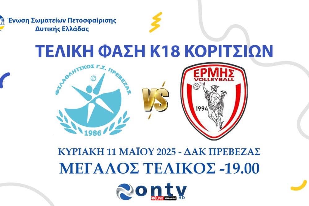 Τη Κυριακή 11-5-2025 στις 19:00 στο ΔΑΚ ΠΡΕΒΕΖΑΣ η ομάδα μας θα αντιμετωπίσει τον ΕΡΜΗ ΗΓΟΥΜΕΝΙΤΣΑΣ στο μεγάλο τελικό που θα αναδείξει τη πρωταθλήτρια της Βορειοδυτικής Ελλάδας.